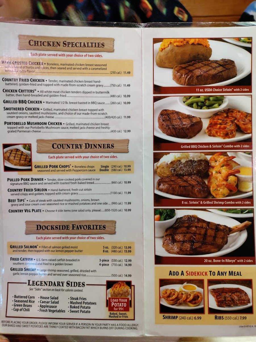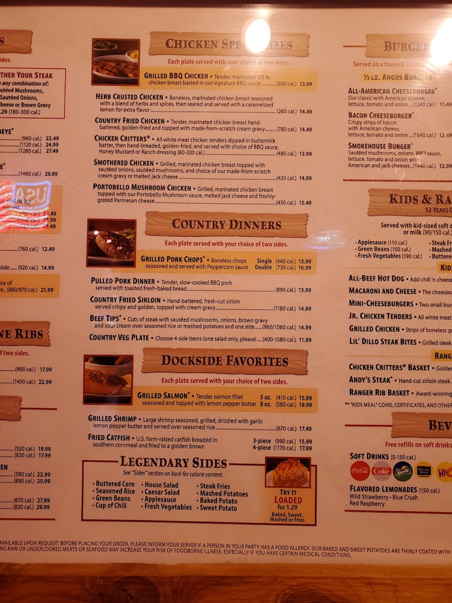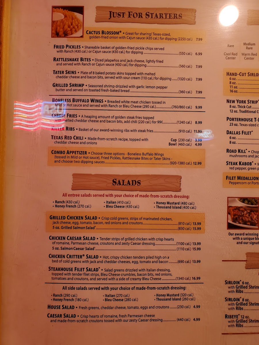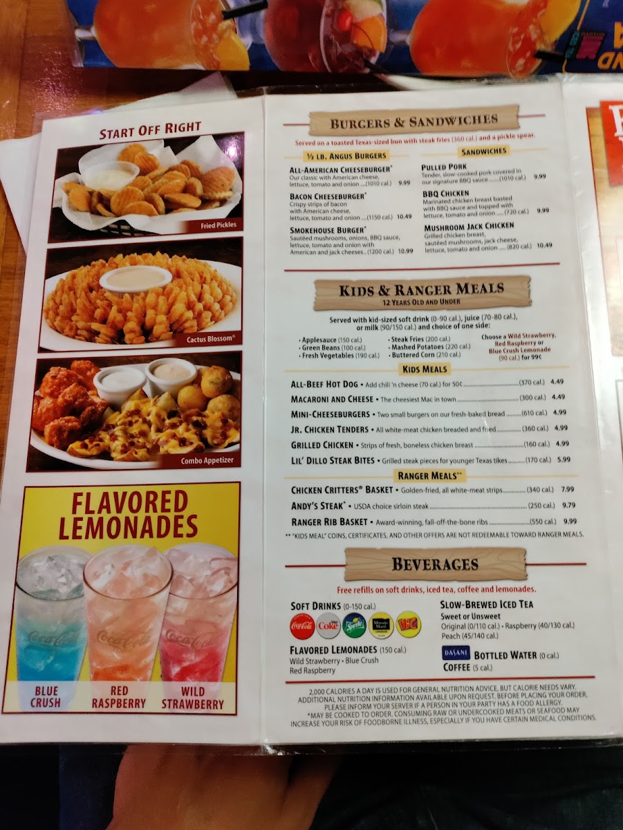 Start your meal with shareable appetizers like the Cactus Blossom®, a golden-fried onion served with Cajun sauce, or a basket of Fried Pickles, perfect for pulling together with friends or family. For the main course, hand-cut steaks such as the lean Sirloin, tender Dallas Filet, or juicy Ft. Worth Ribeye are served alongside your choice of two sides, making them a reliable choice for an evening out or a special weekend dinner.
